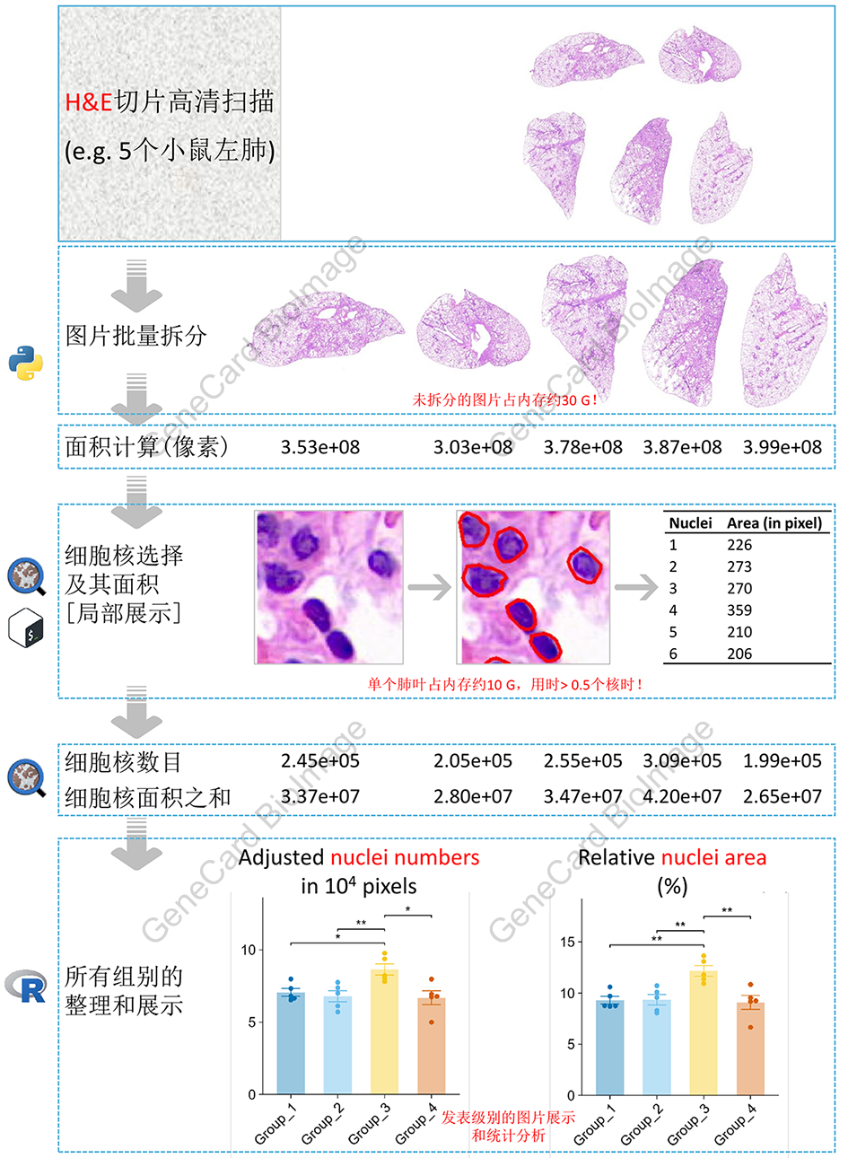 本流程通过计数H&E切片中的相对细胞(核)总数和相对细胞核总面积,以实现客观的H&E切片自动分析。
