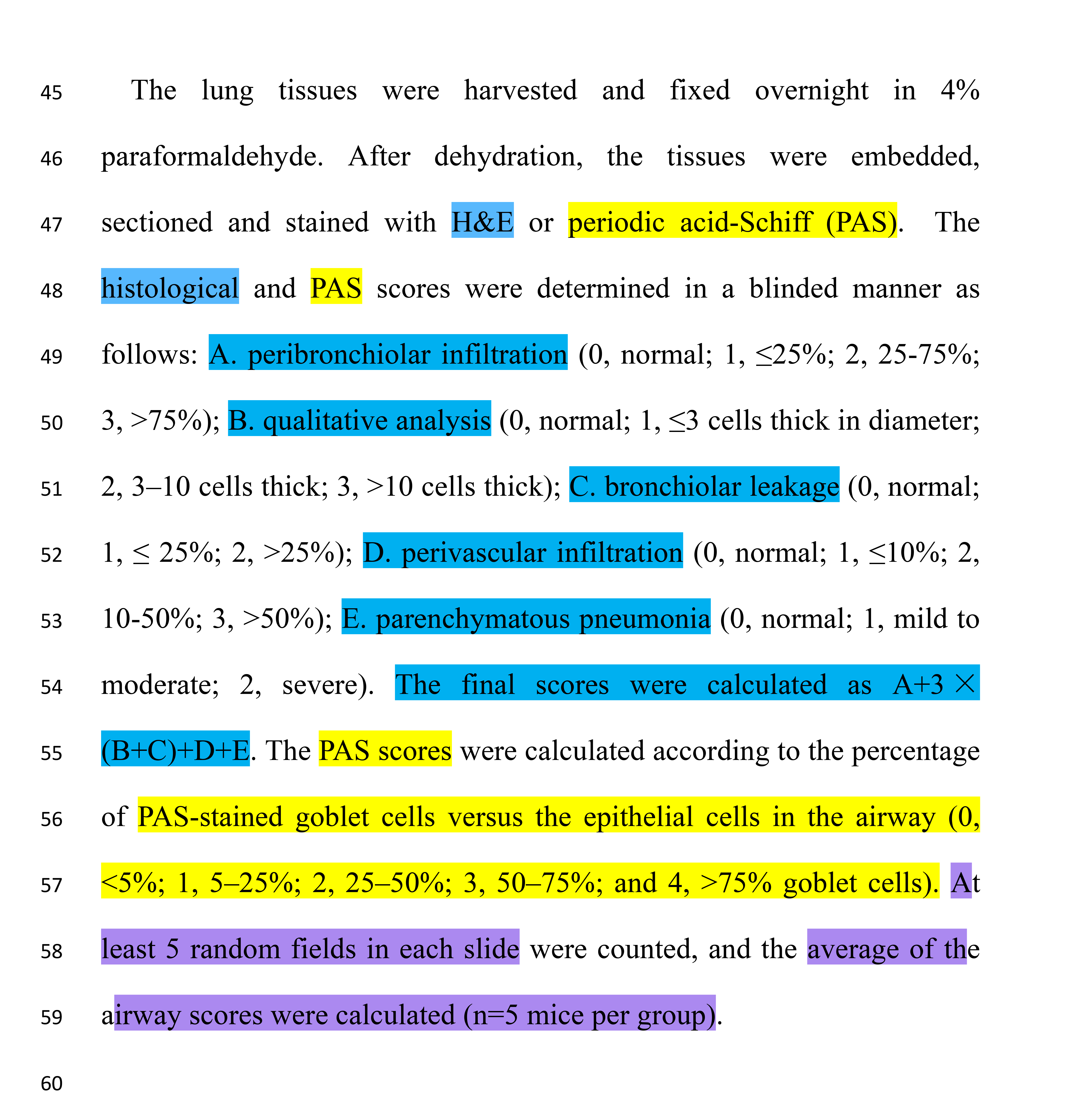 PAS染色主要用于染色含有高比例碳水化合物(包括糖原)的结构 (5),比如用于小鼠肺哮喘模型的粘液分泌鉴别 (6)。