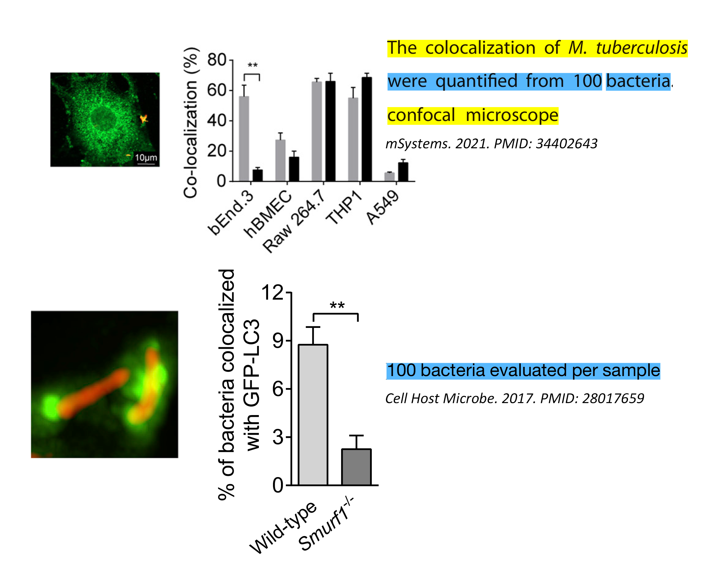 比如下面这两篇文章(1), (2),作者通过眼睛观察图像,来判断胞内菌是否和宿主细胞蛋白共定位。