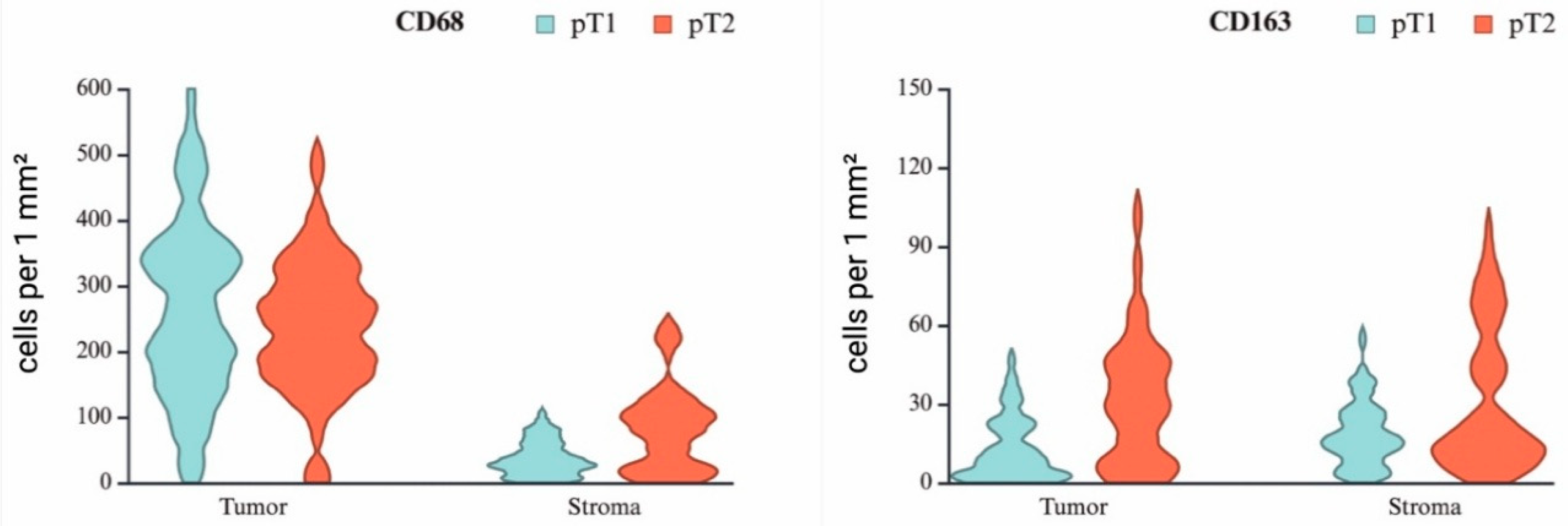 在pT1和pT2阶段之间,CD68+ TAMS密度没有显著统计学差异。