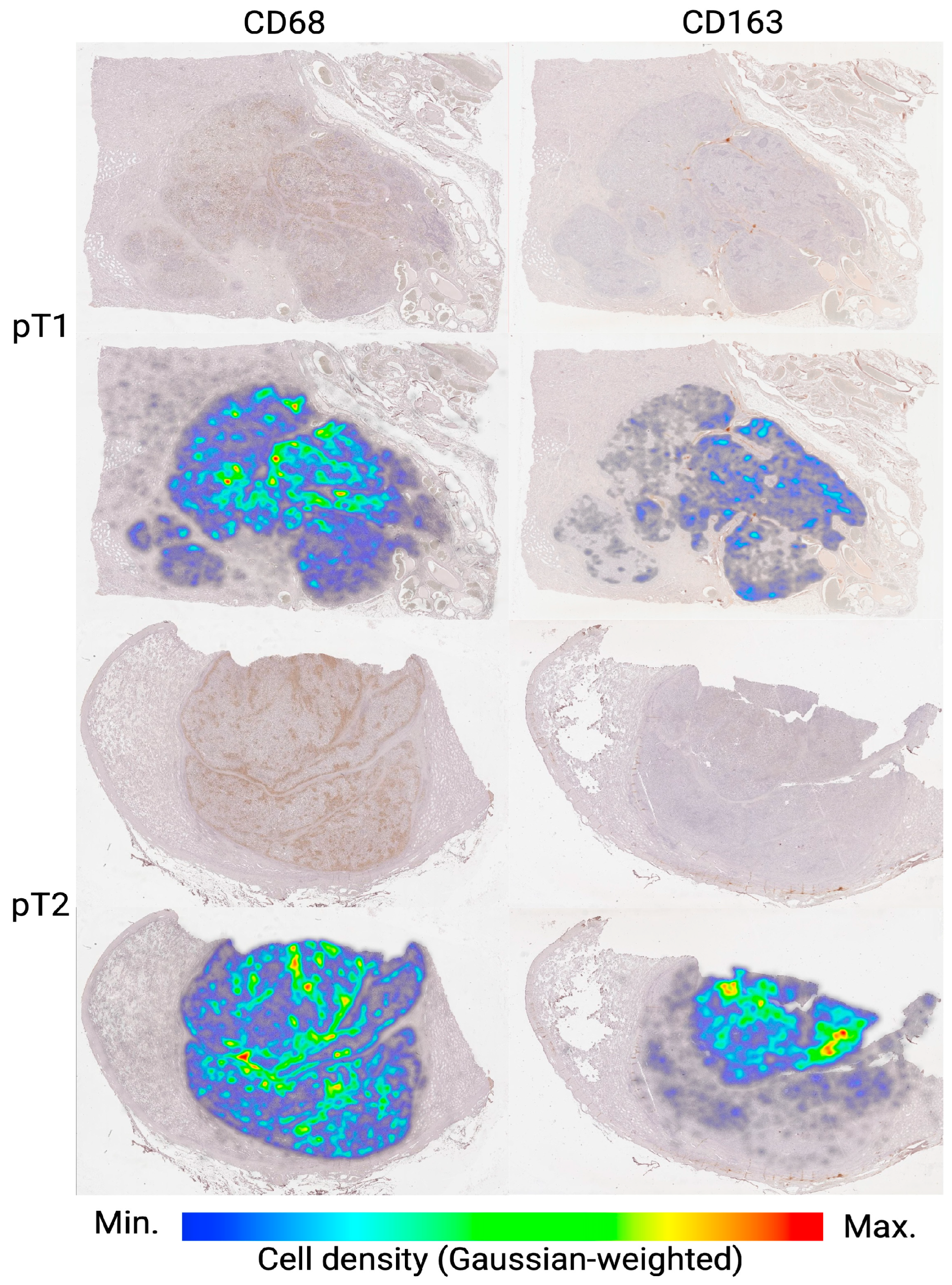 pT2肿瘤显示出CD163+ TAMs密度较高的趋势,提示随着肿瘤分期的进展,M2型极化可能增加。