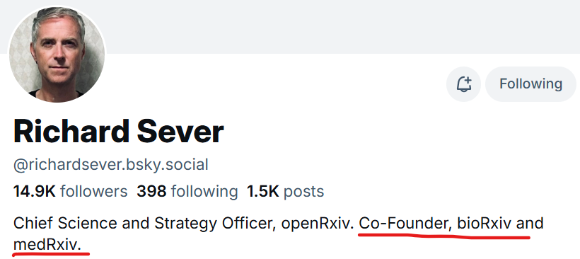 通过作者的Bluesky账号,知道作者是bioRxiv和medRxiv的联合创始人;同时,作者是openRxiv的首席科学和战略官。