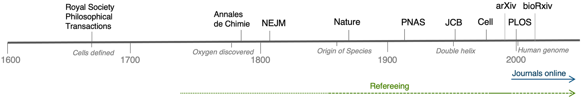 The first scientific journal—Philosophical Transactions of the Royal Society—was launched in 1665 by Henry Oldenburg (Journal Des Sçavans was launched earlier the same year but was broader in scope).