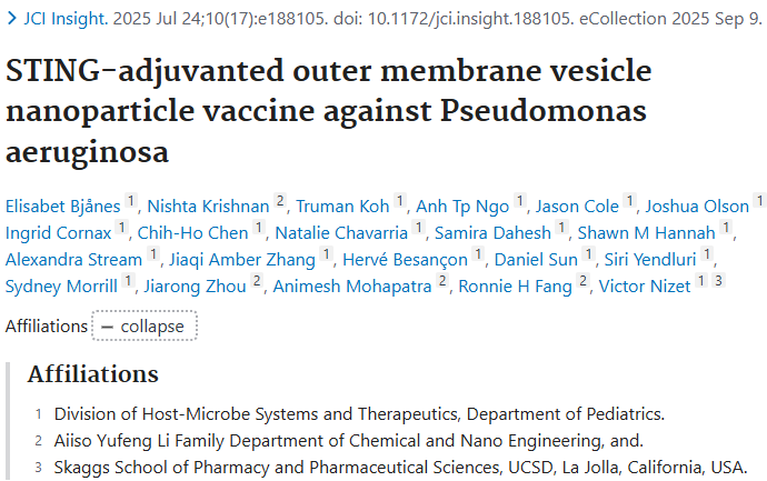 E. Bjånes, N. Krishnan, T. Koh, A. T. P. Ngo, J. Cole, J. Olson, I. Cornax, C.-H. Chen, N. Chavarria, S. Dahesh, S. M. Hannah, A. Stream, J. A. Zhang, H. Besançon, D. Sun, S. Yendluri, S. Morrill, J. Zhou, A. Mohapatra, R. H. Fang, V. Nizet, STING-adjuvanted outer membrane vesicle nanoparticle vaccine against pseudomonas aeruginosa. JCI Insight 10 (2025).