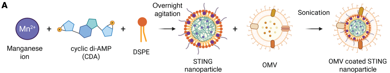 … STING佐剂化的纳米粒子核心由锰离子、环二-AMP和DSPE-H11(一种改良的磷脂)组成,然后覆盖上从PA14分离出的外膜囊泡(OMVs)…