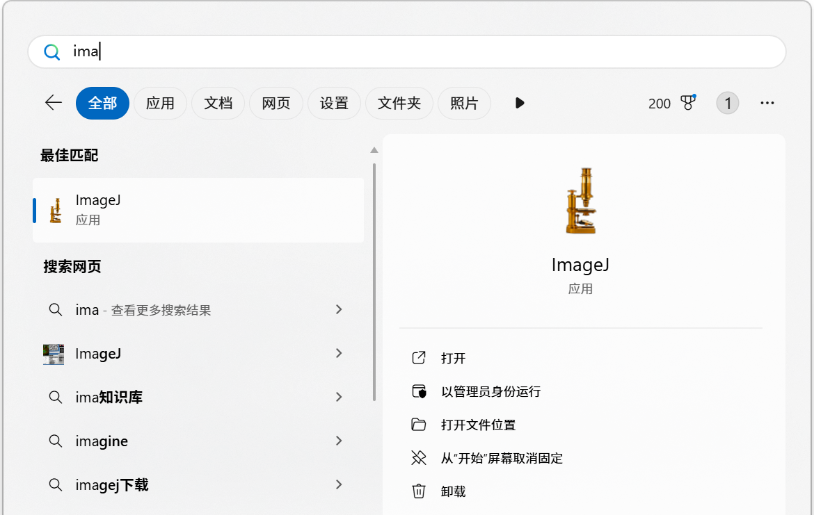 点击任务栏Windows图标 → 在搜索框输入imagej → 回车或点击ImageJ图标,就可以启动ImageJ了。