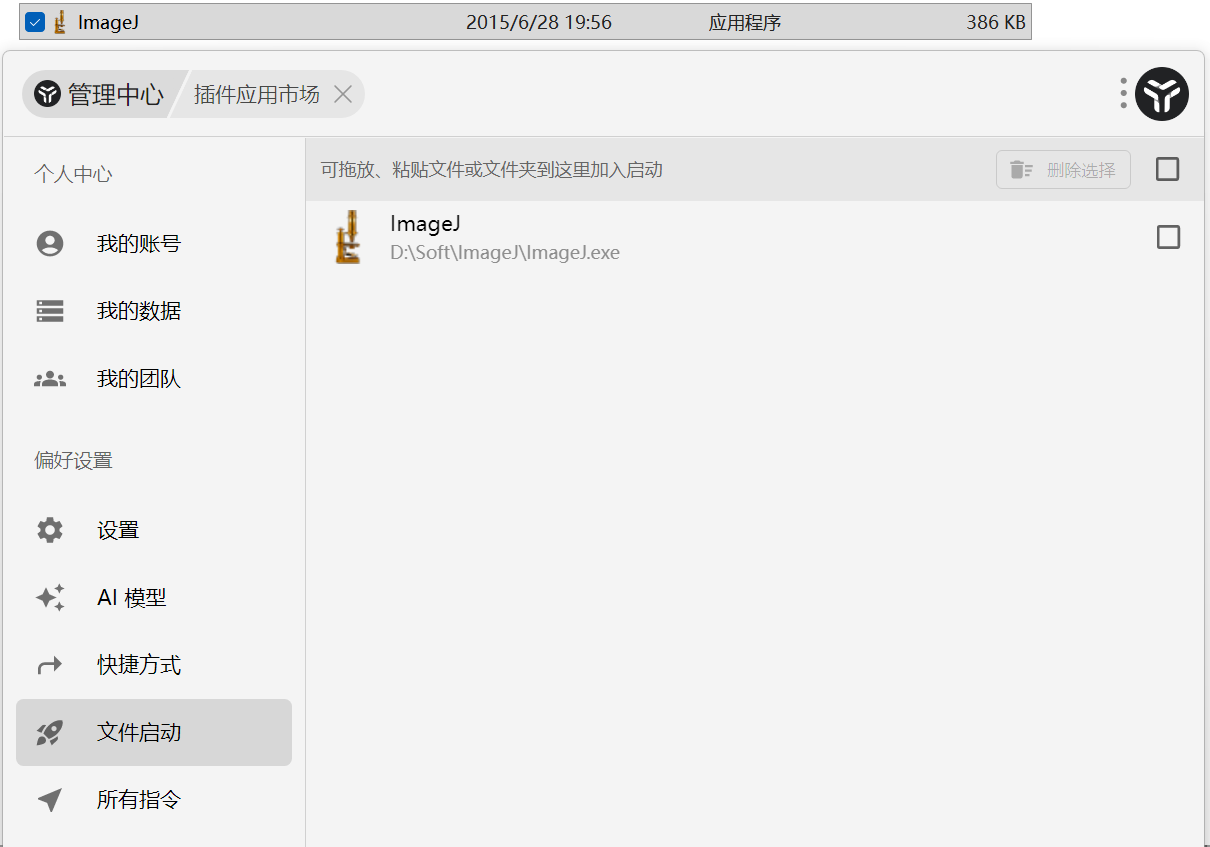 默认通过alt + space组合键唤起uTools窗口(确保已经运行uTools) → 拖拽ImageJ.exe到uTools窗口的搜索区 → 回车即可添加ImageJ到uTools启动列表。