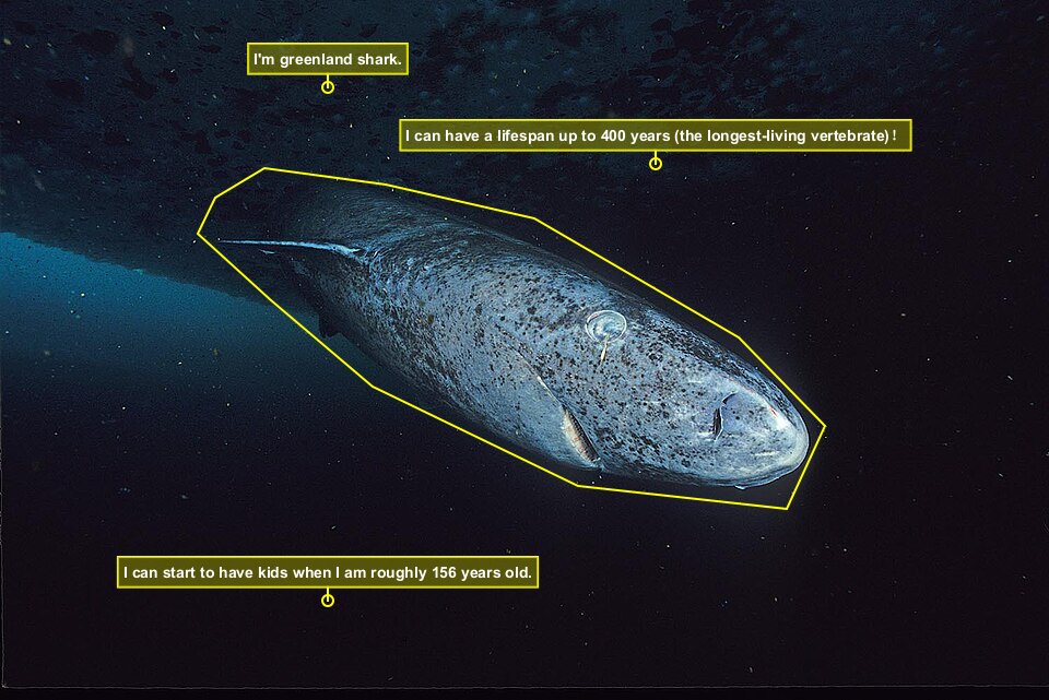 … the largest animal (502 cm) (i.e. Greenland shark) to be 392 ± 120 years old. (2)