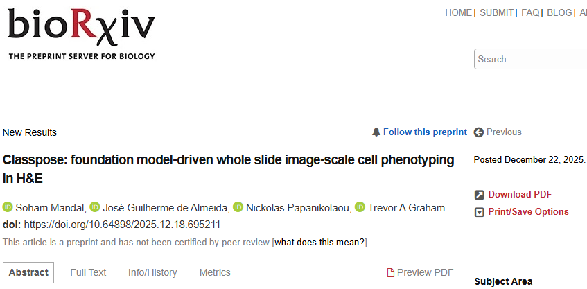 看到一篇2025-12-22日上线的预印版文献(1),报道了Classpose,可用于HE染色全片的细胞类型鉴定。