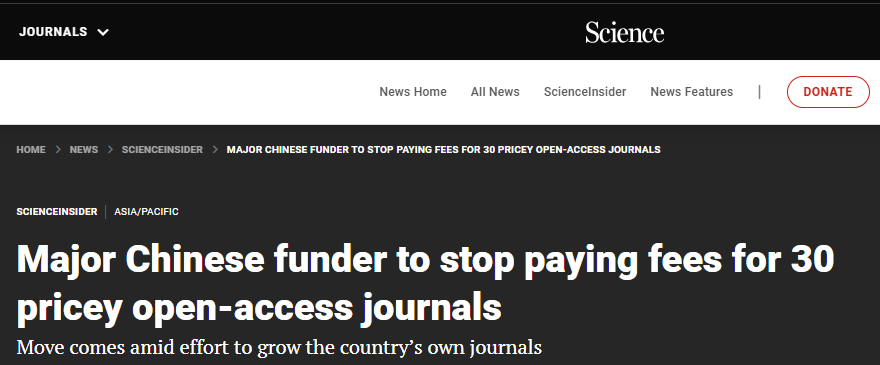 CAS … plans to stop paying to publish their papers in dozens of international free-to-read journals it regards as too expensive … include Nature Communications, Cell Reports, and Science Advances … expected to take effect on 1 March.